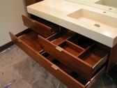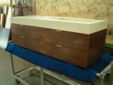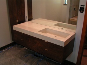 walnut vanity - 4 active drawers, white lukecrete top with integral bowl